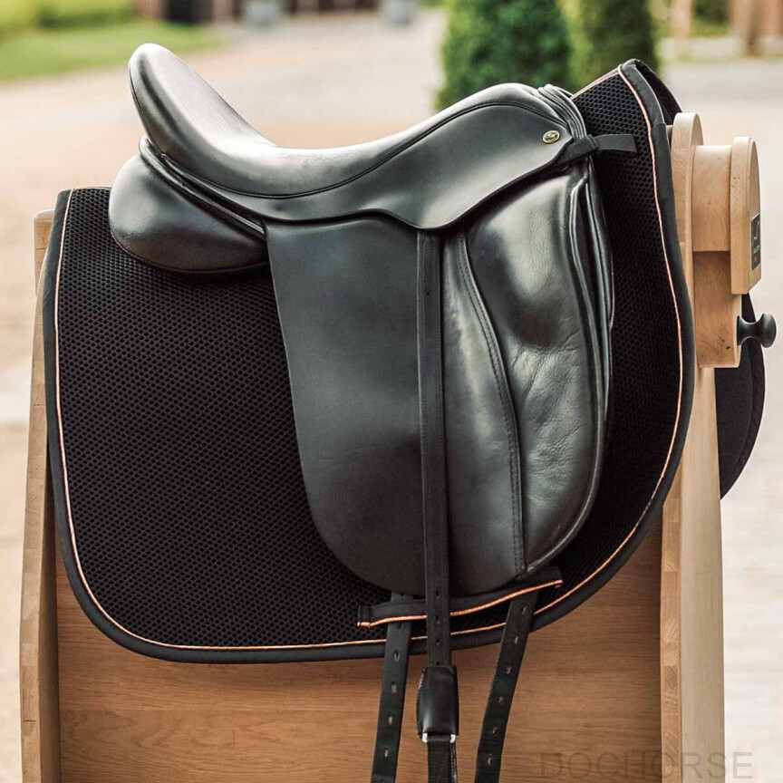 Alweer mijn 4e dekjeIk ben echt fan van deze zadeldekjes, ik had er al 3 met een lederen bies en ik wou voor de afwisseling eens een chiquere uitvoering. Ik heb de zwarte met rose goud, staat echt heel chique bij mijn dressuurzadel.