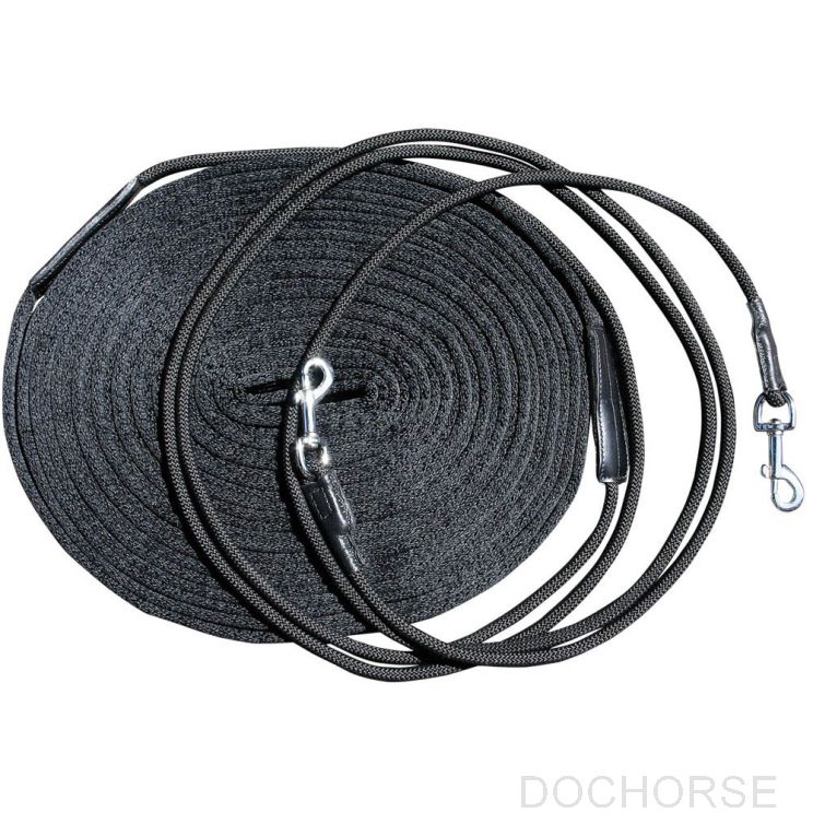 Harry-s-HorseDubbele longeerlijn bestaat uit twee ronde koorden, te bevestigen aan de bitringen door middel van twee zilverkleurige muskatonnen. Daarna gaat dit over in een plat, soft webbing lijn.