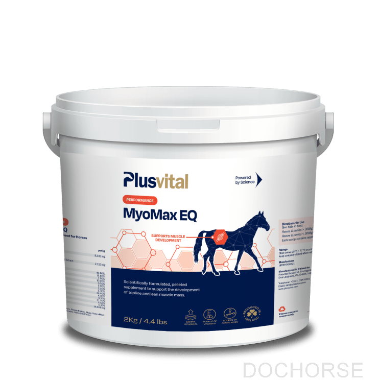 Plusvital Myo-Max EQ is een wetenschappelijk geformuleerd, gepelleteerd supplement dat is ontwikkeld ter ondersteuning van de ontwikkeling van de bovenlijn en magere spiermassa bij paarden.