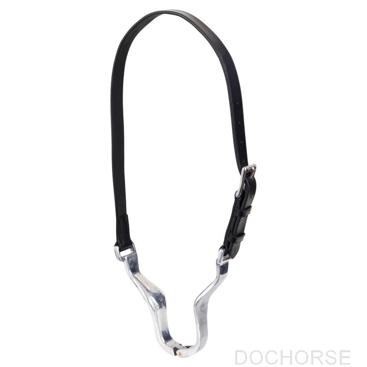 PremiereLederen riem met een aluminium middenstuk die vlak achter het hoofd van het paard wordt vastgemaakt met een gespsluiting.