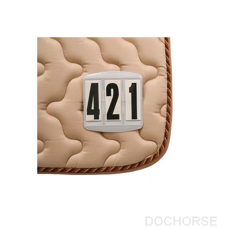 Equitheme3 cijferige startnummers om te bevestigen aan je zadeldekje. De bevestigspunten kan je zelf aan het zadeldeke maken zodat je de startnummers eraf kan halen als je het dekje wilt wassen.